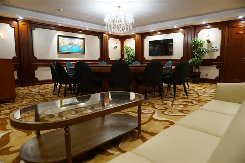 高级贵宾房,墙面使用美国红橡实木护墙板,配以简欧的橡木线条,酒红色开放漆既雍容华贵,又保留了原木的质感。地面的尼龙印花地毯、欧式卷草花纹,壁灯,古典水晶吊灯,无不营造出沉稳、华贵的气度。