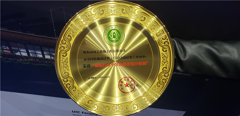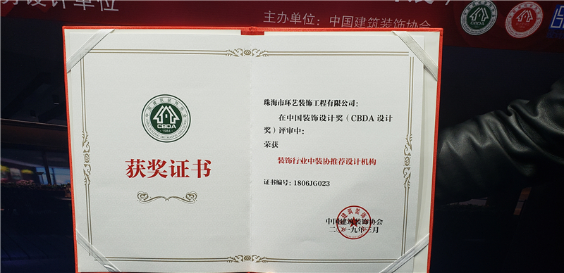 经活动组委会评审,珠海市环艺装饰工程有限公司荣获机构类“CBDA——装饰行业中装协推荐设计机构”奖。